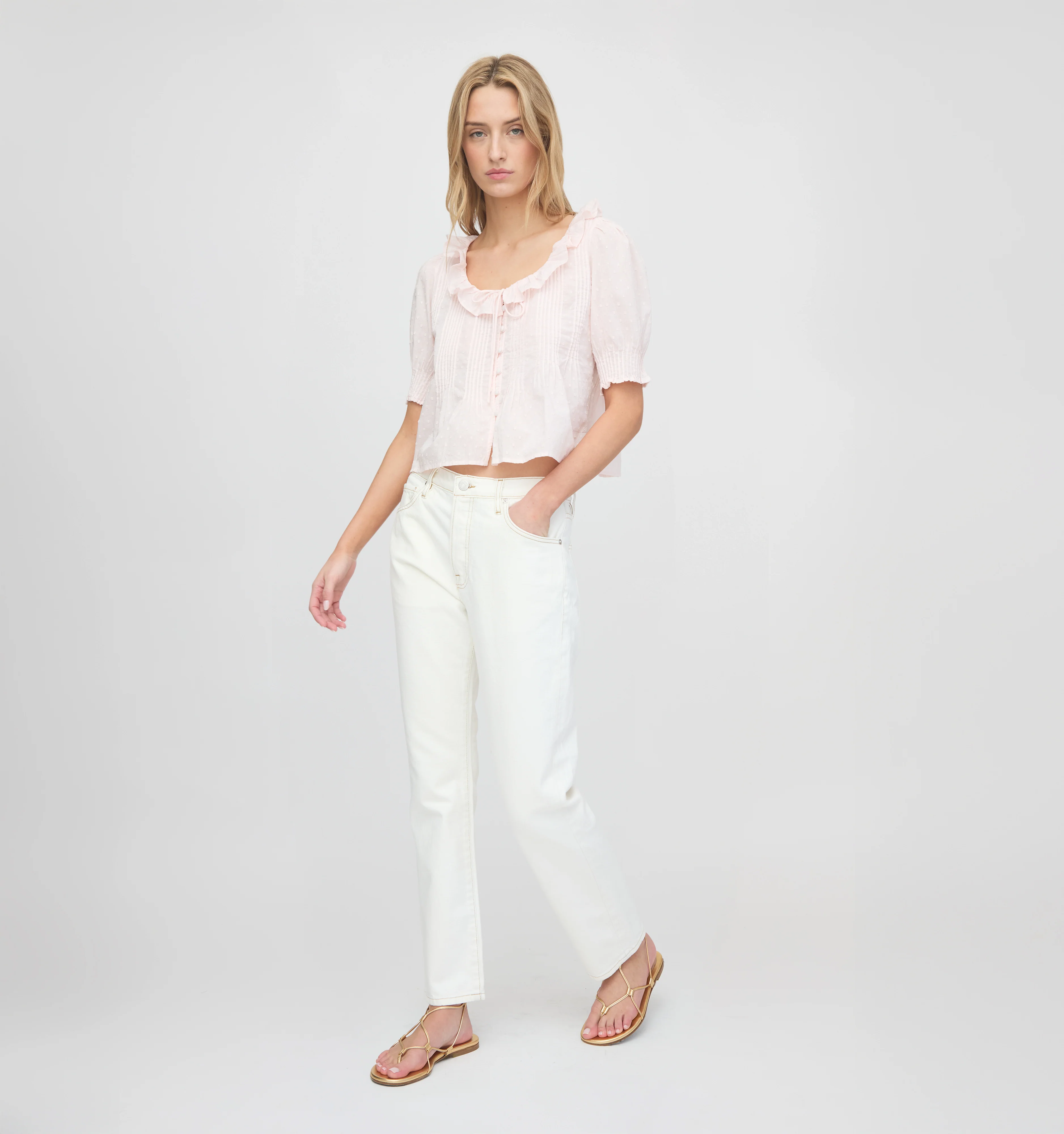 Meet the Camri Top. Camri is crafted from an airy, lightweight cotton voile and features a rounded, softly ruffled neckline finished with a functional bow detail. The covered buttons down the front are fully functional.